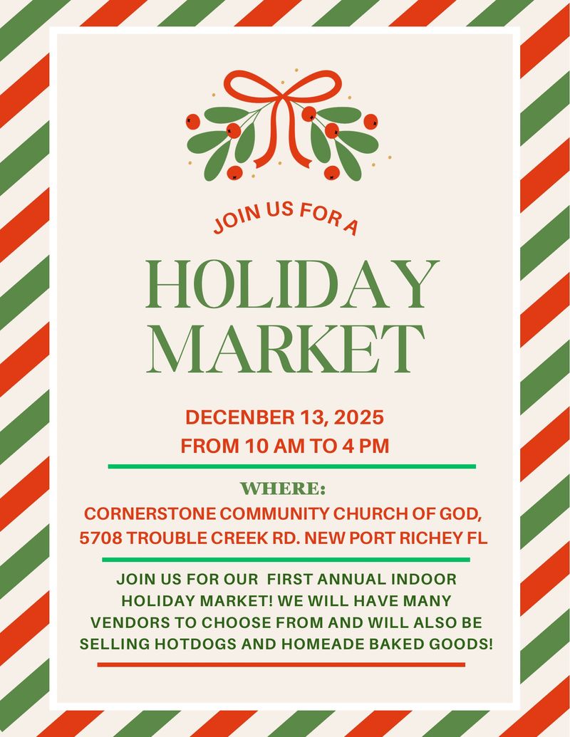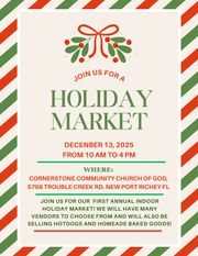 Join us for our first annual indoor Holiday Market! We will have many vendors to choose from and will also be selling hot dogs and homemade baked goods!